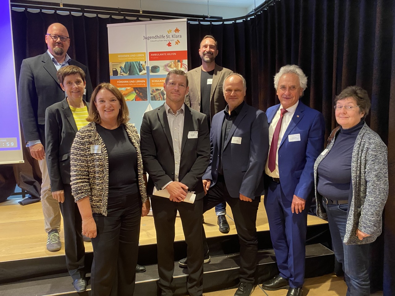 Von links: Professor Johannes Lohner von der Hochschule für angewandte Wissenschaften Landshut, KJF-Vorständin Barbara Igl, Bereichsleiterin Jugendhilfe St. Klara Claudia Kronfellner, Jugendrichter Boris Schätz, Wendelin Landesberger, Teamleiter Jugendgerichtshilfe Jugendhilfe St. Klara, Frank Eichler, Gesamtleiter Jugendhilfe St. Klara, der Freisinger Landrat Helmut Petz und die Freisinger Sozialreferentin Dr. Charlotte Reitsam.