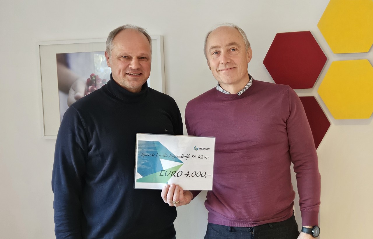 Vor gut 12 Jahren entstand ein Kontakt zwischen dem damaligen Kinderheim St. Klara und dem Unternehmen, das heute als Teil eines großen globalen Unternehmens als HxGN Safety & Infrastructure GmbH im Münchner Norden aktiv ist. Die Personalleitung des Unternehmens, Eva Gschlössl hat sich seitdem regelmäßig im Unternehmen dafür eingesetzt, materielle und finanzielle Unterstützung für die Jugendhilfe St. Klara in der Mitarbeiterschaft zu kreieren. Vor einigen Jahren hat dann Edward Gawron, einer der Technischen Leiter, begonnen, seine schönen Aquarellmalereien in der Belegschaft zu Gunsten des Kinderheims zu verkaufen. Diese regelmäßige Aktion und andere Aktivitäten haben in diesem Jahr eine Spende von 4.000 € ermöglicht. (Im Bild Herr Gawron rechts mit der Gesamtleitung Herr Eichler)